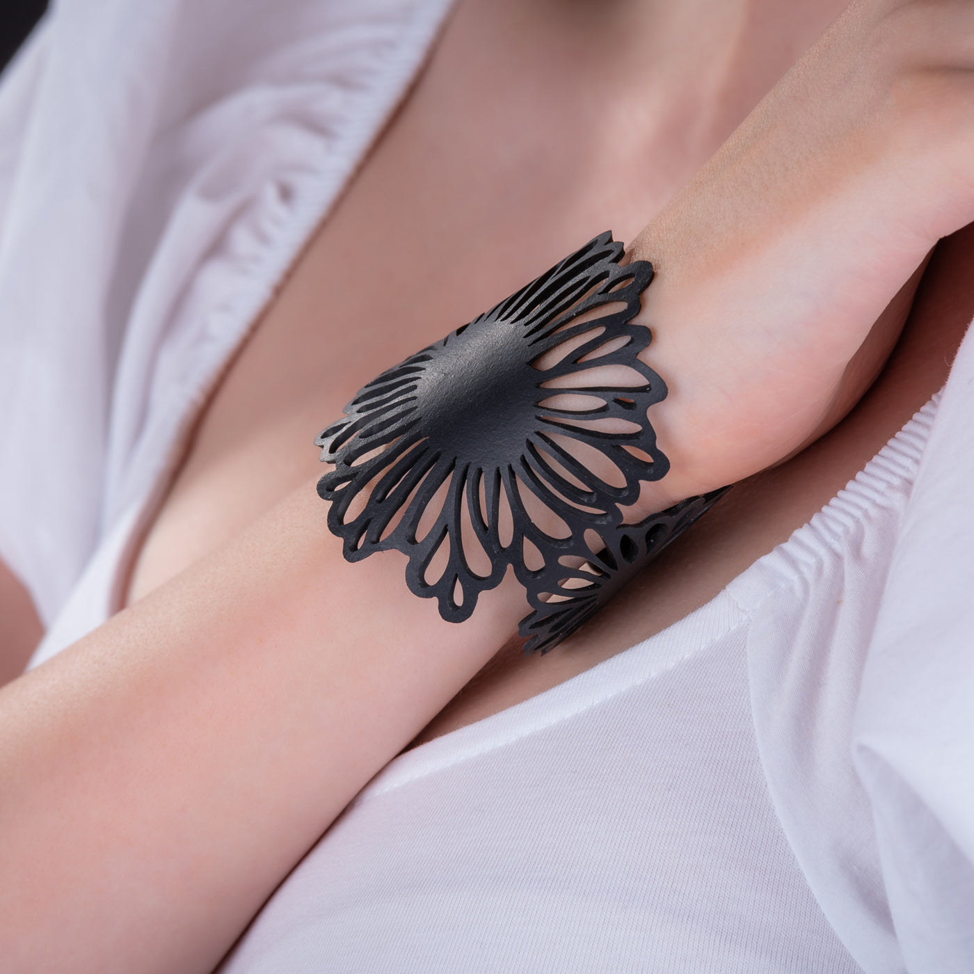 The Dandelion Upcycled Flower Bracelet is handmade in a way which is both eco-friendly and cruelty-free. Reclaimed inner tubes are a popular leather substitute due to their similar textures and unique patterns.